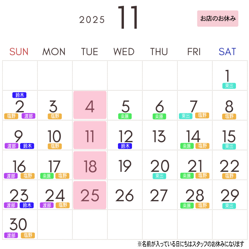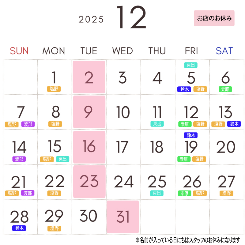 ※スタッフのお休みが変更になる場合が御座いますので詳しくは店舗にお問い合わせください