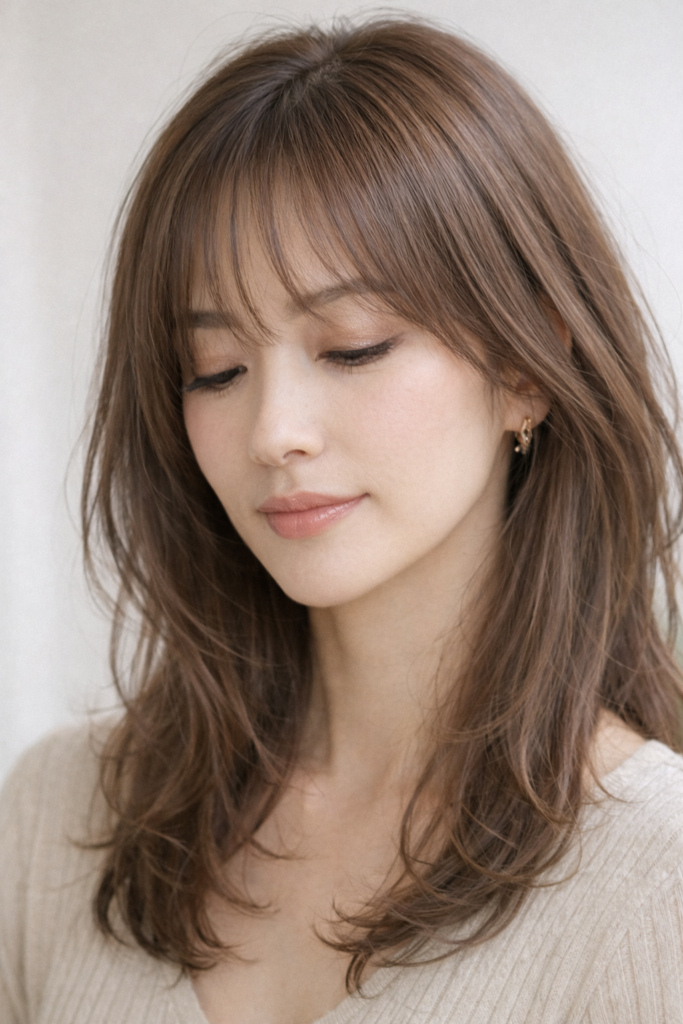 前髪は透け感のあるシースルーバングで、柔らかい印象に