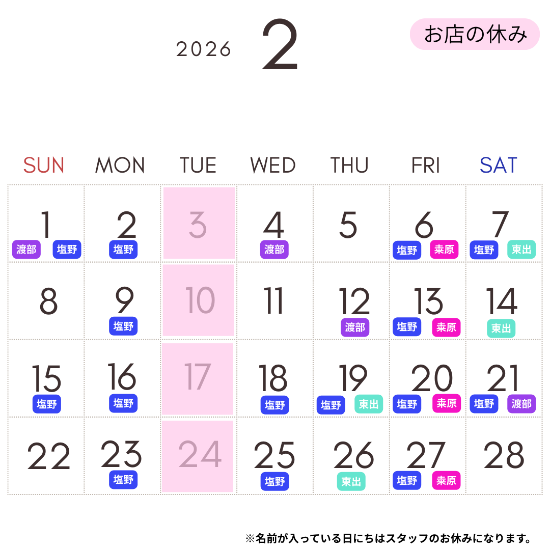 ※スタッフのお休みが変更になる場合が御座いますので詳しくは店舗にお問い合わせください