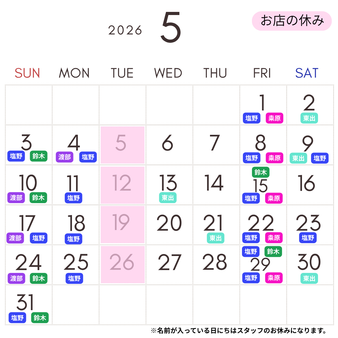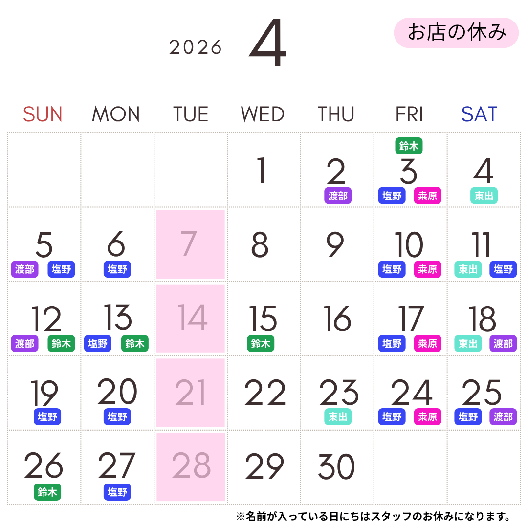 ※スタッフのお休みが変更になる場合が御座いますので詳しくは店舗にお問い合わせください